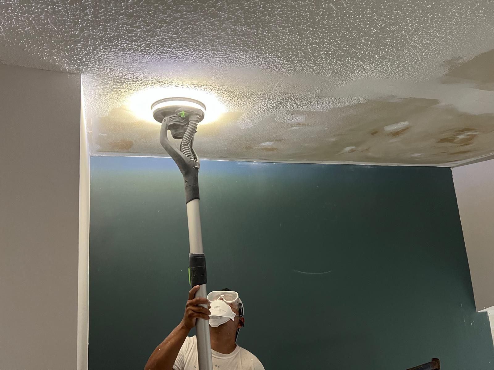 Ceiling is wetted and texture is carefully scraped away.